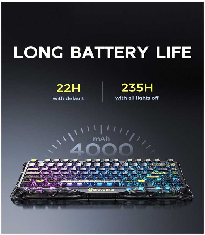 - ⌨Reliable Battery Life: Featuring a lightweight 4000mAh lithium-ion battery, the GravaStar Wireless Keyboard stores enough power that you might even forget it needs charging. With up to 235 hours between charges*, it can keep up with the longest marathon gaming sessions, anywhere they may take you. When it finally does need a charge, connect the included USB-C cable to replenish your power without interrupting your game.