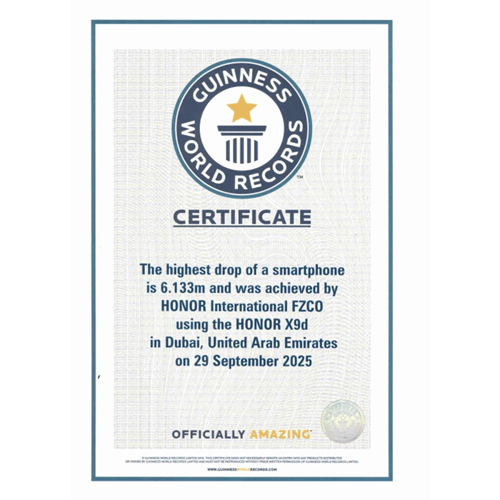 Drop Resistance: HONOR X9d Holds Guinness Record — Highest Phone Drop Height (6.133m).