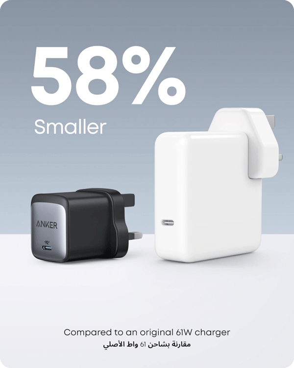 Downsized Design: At 58% smaller than an original 61W USB-C charger, Anker Nano II takes up less space while giving you just as much power.