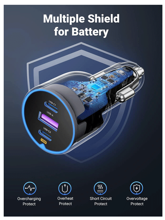 PD 100W High-Speed Charging: This 3-port USB C Car Charger supports PD 100W(USB-C2), PD 30W(USB-C1), and SCP 22.5W high output. The Type-C2 port supports 100W output to charge Macbook Pro 16” up to 100% in just 90min, quite faster than other car chargers.